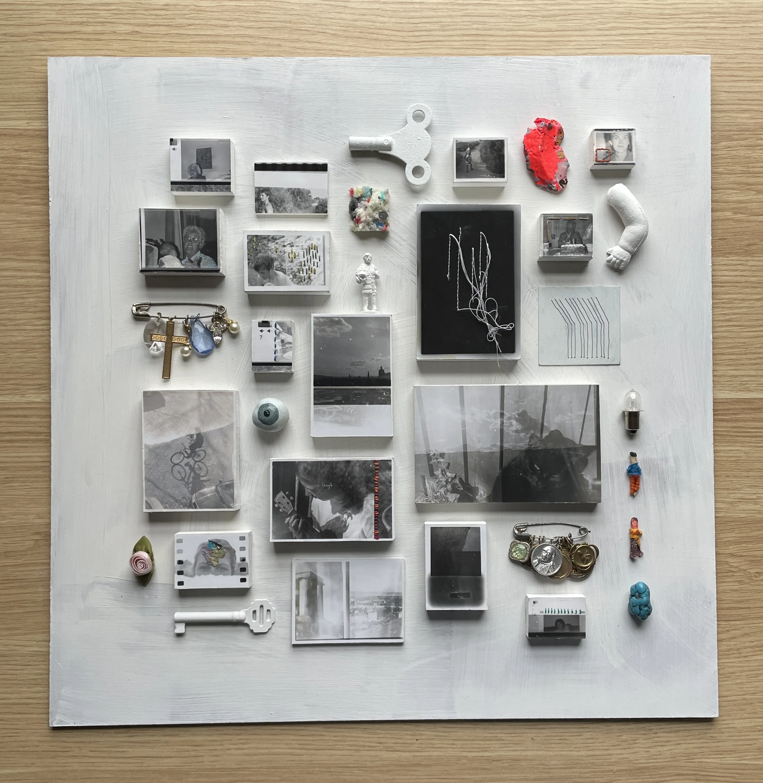 mixed media assemblage, using objects collected from my family + hand altered 35mm film photos from family archives + my own, mounted on wood (reworked in 2024 from a piece I originally made in 2012).